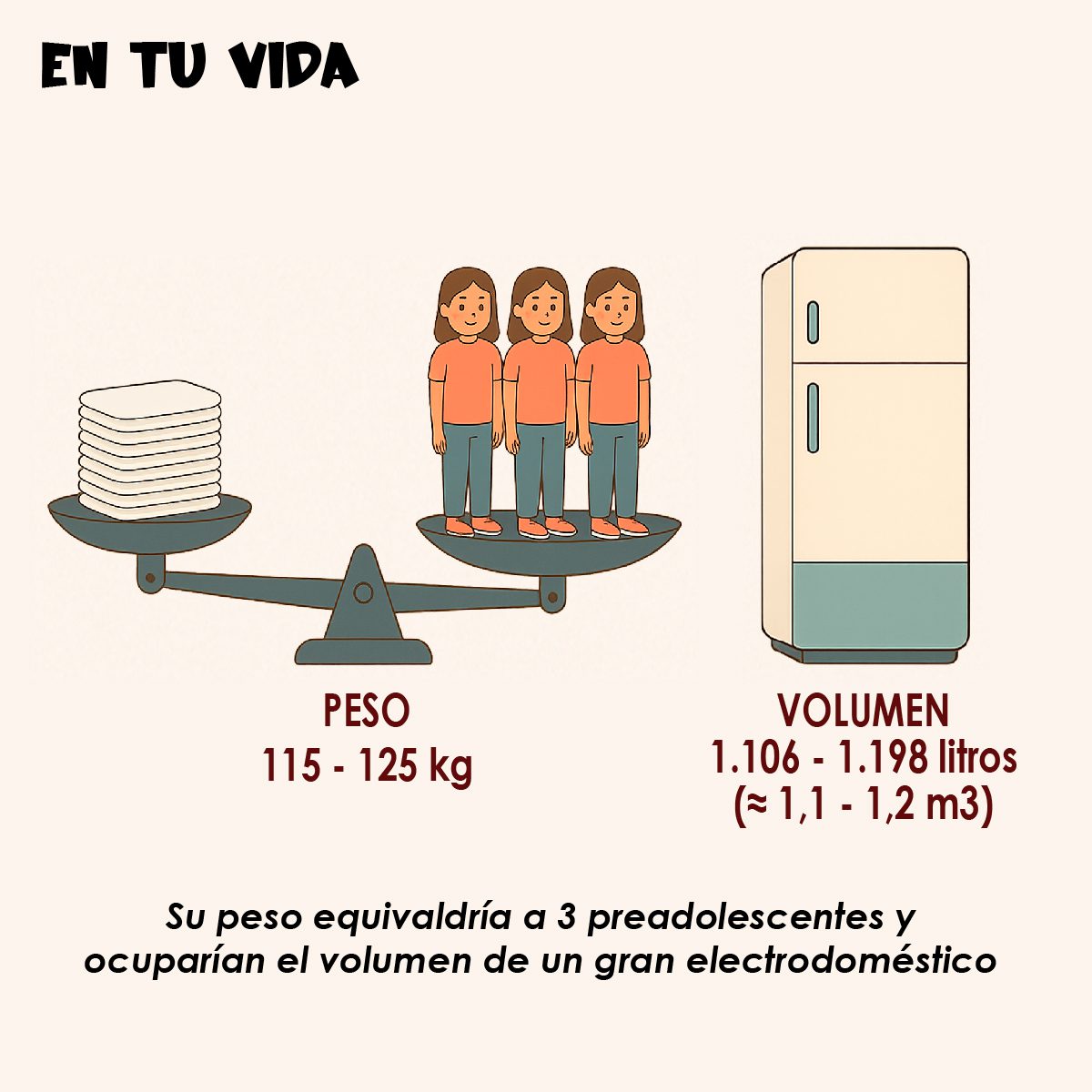 | ¿Qué volumen ocuparía? | 27,6 – 30 litros | 1.106 – 1.198 litros (≈ 1,1 – 1,2 m³) |