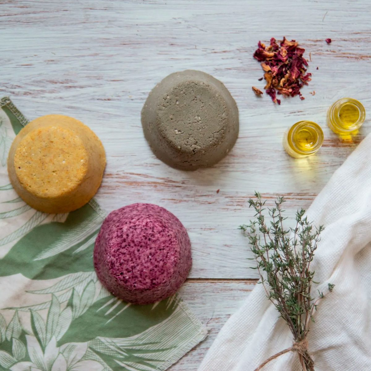 Limpiador facial sólido para piel normal a base de Arcilla Blanca, Flor de Hibisco, Agua de Rosas y Aceites de Almendra y Geranio envuelto en tela.